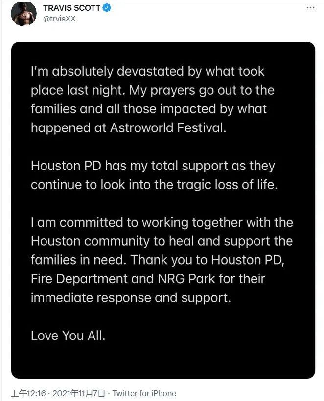 事情發生後,Travis Scott發文表示他對於音樂節上發生的事情深感震驚和悲痛,他也願意盡全力配合後續調查