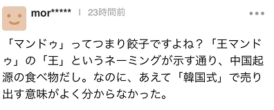 “希傑集團”為了在日本推廣所謂的“MANDU”大費周章,不過,一些日本網友並不買賬。有人評論稱,“所謂的MANDU其實就是餃子吧,‘王MANDU’裏面還有個‘王’子,從命名中就能看出來是中國發祥的食品。儘管如此,還故意加上‘韓式(叫法)’發售,無法理解。”