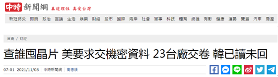 【環球網報道】據台灣“中時新聞網”8日消息,全球芯片荒,美國商務部政府此前要求台積電、英特爾、三星、SK海力士等芯片製造商在今天(11月8日)前提交相關“機密資料”,引起爭議。截至目前為止,包括台積電等23家台灣廠商,都已經在截止日前回復美方“交卷”並回傳相關數據。