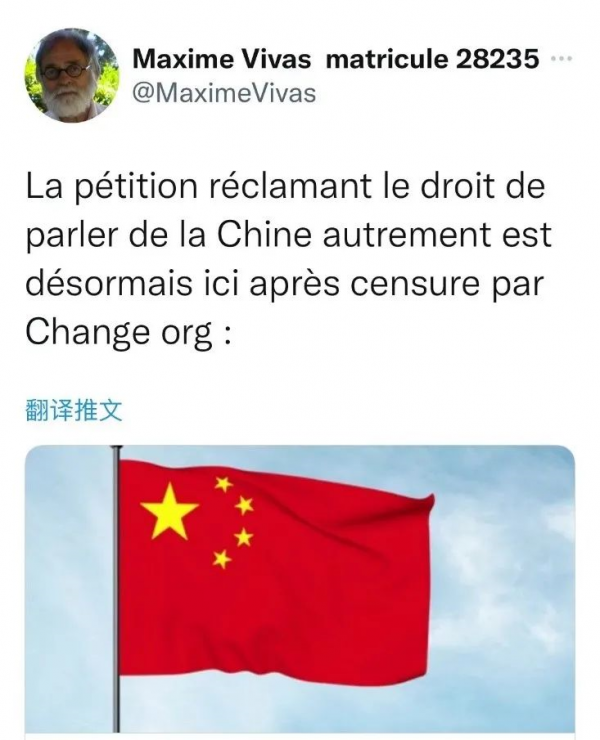 當地時間2日,法國知名作家、時政評論家、記者馬克西姆·維瓦斯在名為Change.org的美國請願網站發起請願,呼籲法國媒體及各界用真相和公正的態度對待中國,但這則請願不久後便遭到刪除。維瓦斯4日在推特上表示,自己的請願書遭到了網站審查,已經不再可見。“他們跟我説這項請願不可見,或是因為鏈接有誤,或是因為違反了社區規則,或者是發起者自己刪掉了。”(下圖)
