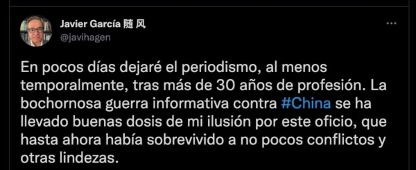 今年9月,西班牙埃菲社駐華記者站負責人哈維爾·加西亞1個半小時內連續在推特上發出14條推文,引發國際媒體人和網民極大關注。加西亞在推文中説,“幾天後我將放棄從事了30餘年的新聞工作,至少是暫時的。這場令人厭煩的反華信息戰幾乎耗光了我的新聞職業理想。”(下圖)