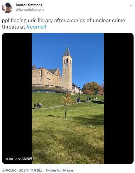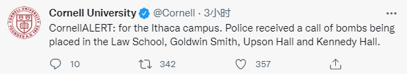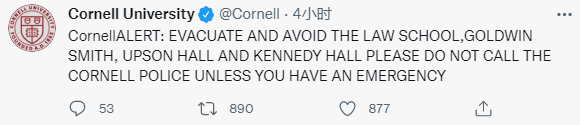 推文顯示,康奈爾大學官方發佈的第一條相關內容提醒學生迅速撤離,“康奈爾警報:撤離以及避開法學院、戈德文·史密斯學院、厄普森大廳、肯尼迪大廳。請不要打康奈爾大學警察的電話,除非你遇到緊急情況。”↓