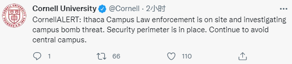 之後,警方介入調查,該校隨之進行更新:“康奈爾警報:伊薩卡校區執法部門正在現場調查學校的炸彈威脅。警戒線已搭好。請避免來中心校區。”“康奈爾警報:伊薩卡校區警方對炸彈威脅的調查仍在進行中,大樓清查工作也在進行。請避免來中心校區。”↓