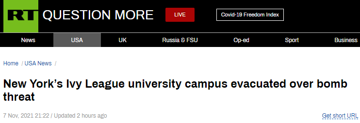 【環球網報道】據“今日俄羅斯”(RT)7日消息,位於美國紐約州伊薩卡的常春藤名校康奈爾大學,當地時間7日下午收到炸彈威脅,該校學生立刻緊急疏散、校園進入封閉狀態。