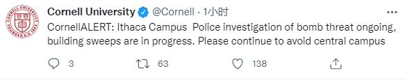 當地時間7日下午,康奈爾大學在其官方推特連續發佈校園警報,更新該事件進展。