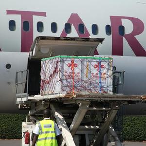 11月7日,工作人員在盧旺達首都基加利國際機場卸載中國援助的新冠疫苗。新華社記者 吉莉 攝