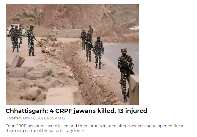 據印度《經濟時報》11月8日報道,這起槍擊事件在當地時間8日凌晨3:15左右,發生在印度中央後備警察部隊(CRPF)第50營位於恰蒂斯加爾邦蘇克馬地區林甘帕裏村的營地內。