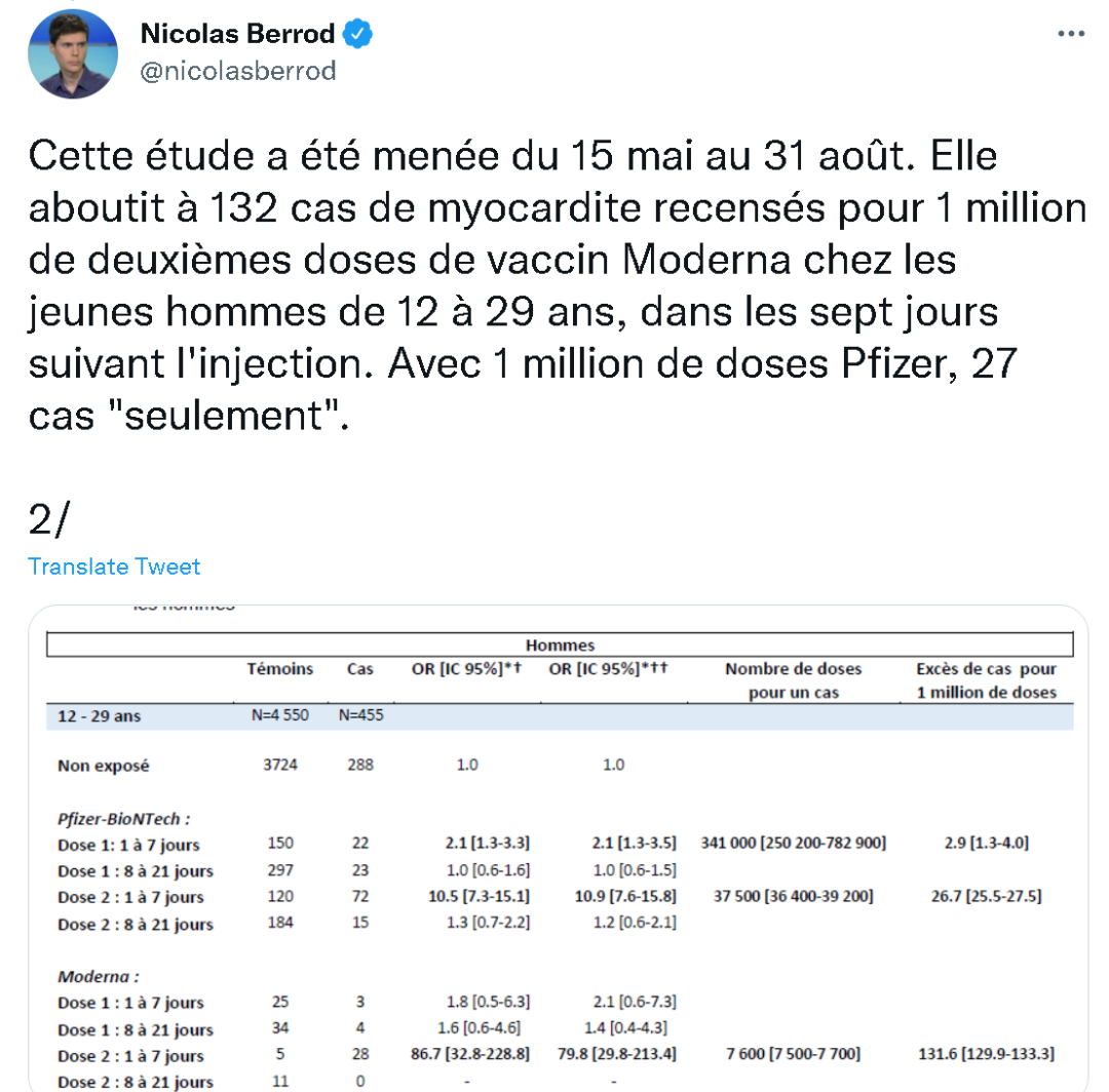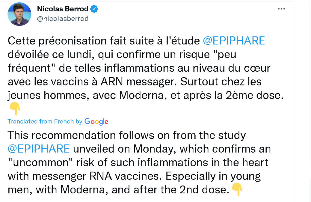 而在近一個月後的今天,由法國國家醫藥安全局和醫保局聯合組成的“疫情燈塔”(Epi-Phare)機構通過研究認定了Moderna疫苗在年輕人中確實存在較高的副作用風險。