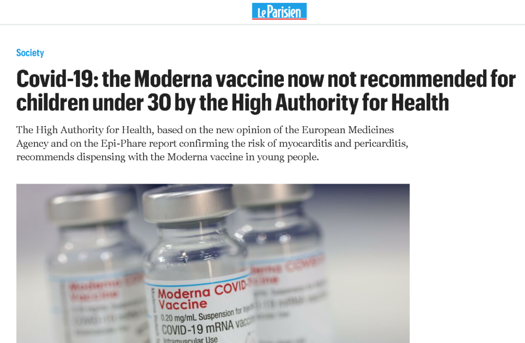 據法國《巴黎人報》報道,負責給法國衞生政策提供指導性建議的法國最高衞生諮詢機構(The Haute Autorite de Sante ,簡稱HAS)今天正式宣佈,鑑於美國藥廠Moderna生產的新冠疫苗對30歲以下人羣存在較高的健康風險,特別是對心臟健康存在副作用,該機構不建議該國30歲以下人羣接種Moderna公司生產的疫苗“Spikevax”——不論是第一針、第二針還是增強針。