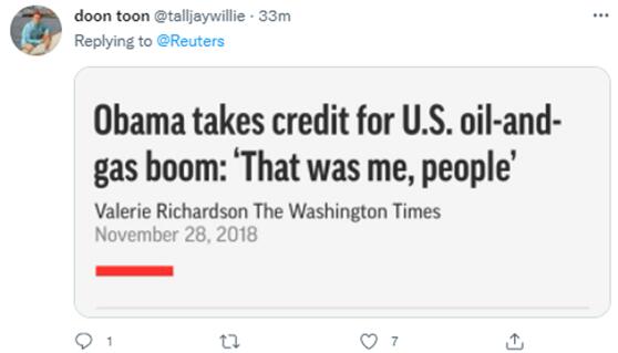 還有網友“分享”了美聯社2018年一篇關於奧巴馬的新聞報道截圖,圖片中的標題醒目寫着:“奧巴馬對美國油氣行業繁榮(的成績)邀功:‘是我乾的。’”↓