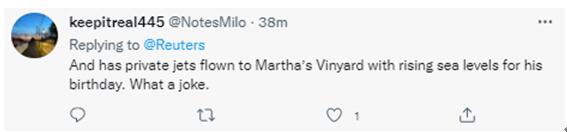 “隨着海平面不斷上升,他坐着私人飛機去瑪莎葡萄園島慶祝自己的生日。多麼可笑。”