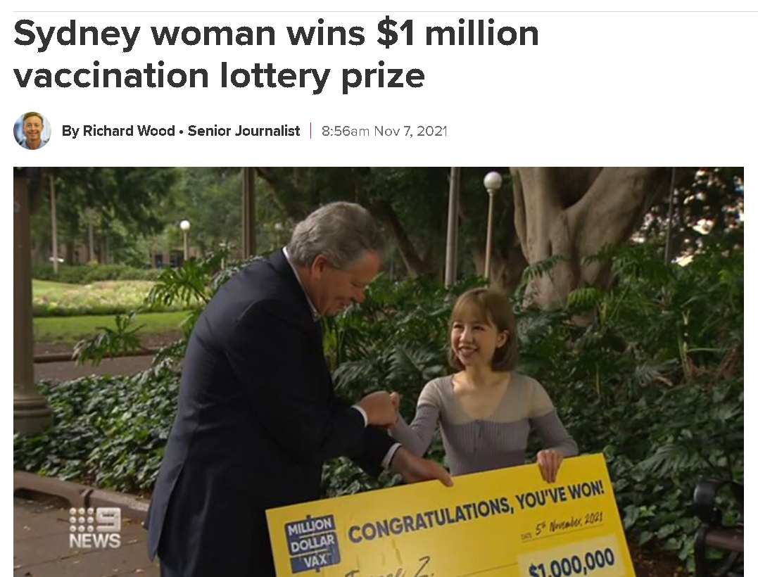 據澳大利亞第7新聞台 8日報道,該國新南威爾士州一名華裔女學生在接種完第二針新冠疫苗後,幸運中得“百萬澳元疫苗”大獎(約合474萬元人民幣),搖身一變成為百萬富翁。