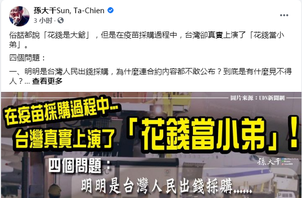 孫大千今天(9日)在臉書提出關於民進黨當局自購疫苗的4點質疑,首先,“明明是島內民眾出錢採購,為什麼連合約內容都不敢公佈?到底是有什麼見不得人?”