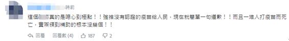 也網友表示,“這個‘政府’(指民進黨當局)真的是噁心到極點!強推沒有認證的疫苗給人民,現在就簡單一句道歉!而且一堆人打疫苗而死亡,實際領到補助的根本沒幾個!”↓