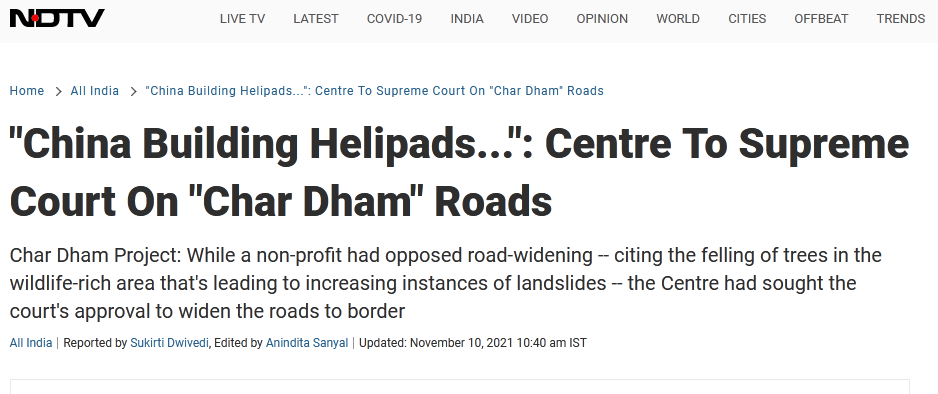 NDTV稱,印度最高法院此前曾表示,這條公路總寬度不能超過5米,但印度政府炒作中國在邊境地區集結“巨量兵力”,宣稱“這種情況下,拓寬該公路具有重要戰略意義” 。