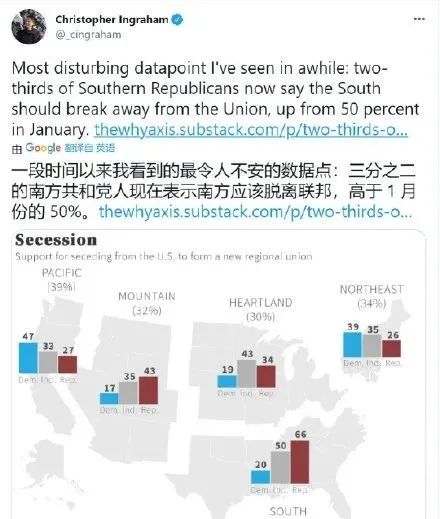 10月份公佈過一項針對美國人的最新民調,就“贊成藍/紅州脱離聯邦,成立各自國家”這一問題,約有52%的特朗普支持者認為是,約41%的拜登支持者也贊成這一想法。