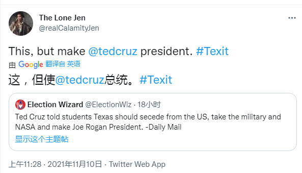 反華政客、得克薩斯州共和黨聯邦參議員特德·克魯茲這兩天也表示,如果民主黨政客“從根本上”摧毀了美國,得州就應該脱離美國獨立。