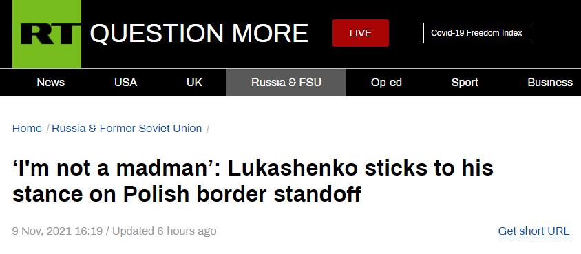 在RT的另一篇報道中,波蘭總理莫拉維茨基當地時間9日在該國議會會議上宣稱,莫斯科是白俄羅斯邊境移民危機的幕後黑手,並聲稱白俄羅斯政府只是俄羅斯實現所謂“新帝國”政策的工具。關於移民危機,俄羅斯外長拉夫羅夫9日早些時候表示,白俄羅斯與波蘭邊境局勢不斷升級是歐盟的錯。解決移民危機應該由那些讓危機開始的人來負責。