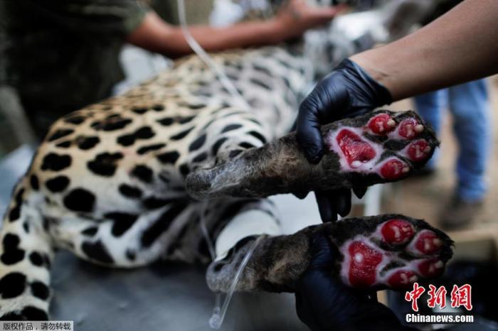 資料圖:巴西戈亞斯州的美洲豹在潘塔納爾濕地的火災中受傷,接受治療。