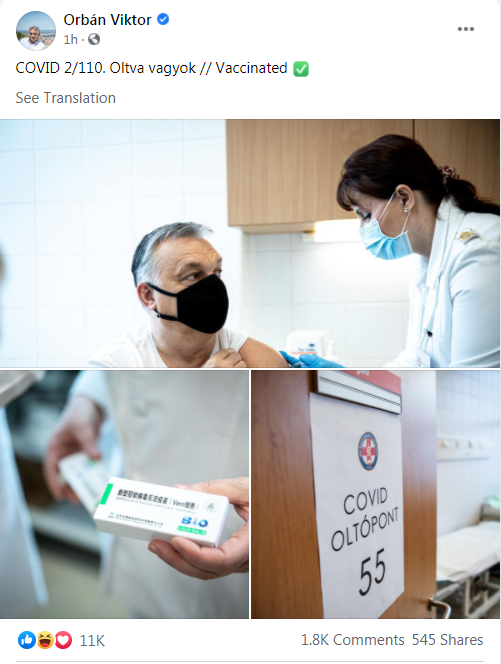 今年2月,匈牙利成為第一個接種中國疫苗的歐盟國家。2月26日,匈牙利總統阿戴爾為國藥疫苗“背書”,公開接種了第一劑該疫苗。兩天後總理歐爾班也接種並在社交媒體上曬圖。