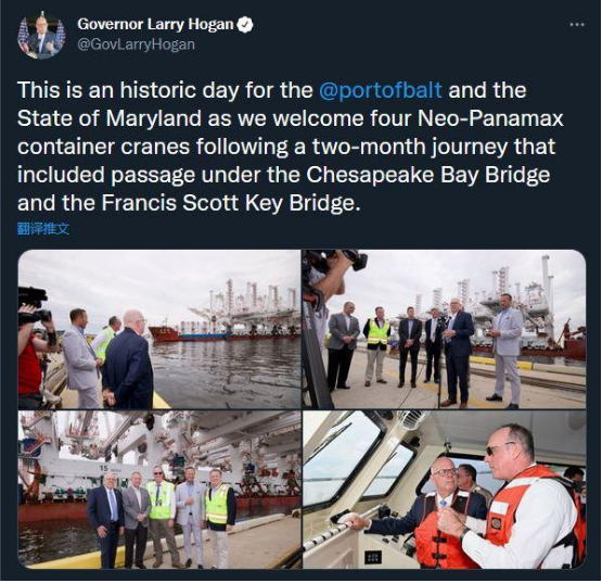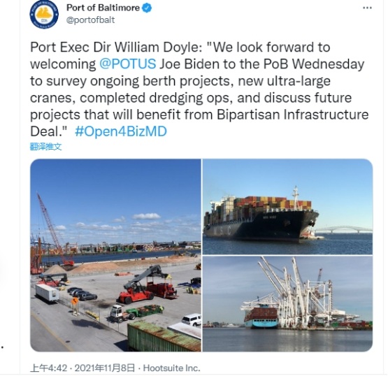 值得一提的是,巴爾的摩港的推特8日就曾預告拜登這場演講,還發布了3張港口的圖片。而放大其中一張照片後,可以發現六個大大的漢字“上海振華重工”(ZPMC)。