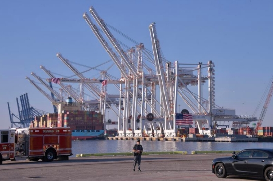 報道描述稱,背景中隱約可見,用於從鄰近的西格特海運碼頭貨輪上吊起集裝箱的巨型起重機。附近卡車大小的集裝箱上,懸掛着紅、白、藍三色的旗幟。