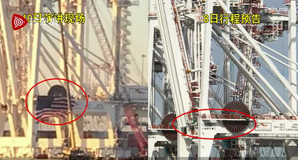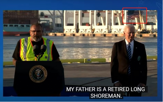 而美媒10日發佈的拜登講話圖中,“上海振華重工”似乎被美國國旗遮蓋住了↓