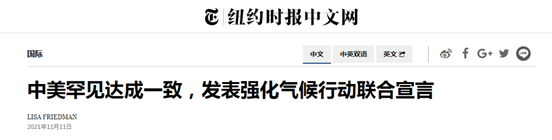 比如,彭博社的文章稱,“中美達成氣候宣言出乎意料,打破了兩個超級大國之間的僵局,標誌着陷入地緣政治競爭的兩個超級大國之間進入難得的合作時刻。”