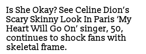 因為過瘦的體型,席琳·迪翁還會被媒體形容為“骷髏一樣的身形”嚇壞粉絲。
