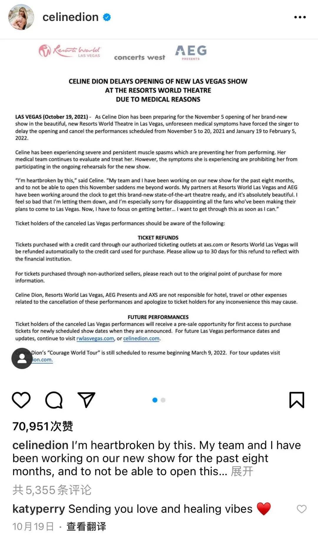 時間回到上個月,席琳·迪翁突然發文宣佈推遲或取消自己在拉斯維加斯名勝世界舉辦的多場演唱會。