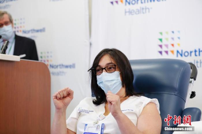 當地時間2020年12月14日,紐約長島猶太醫療中心護士史蒂芬妮接種新冠疫苗後作出勝利表情。中新社記者 廖攀 攝