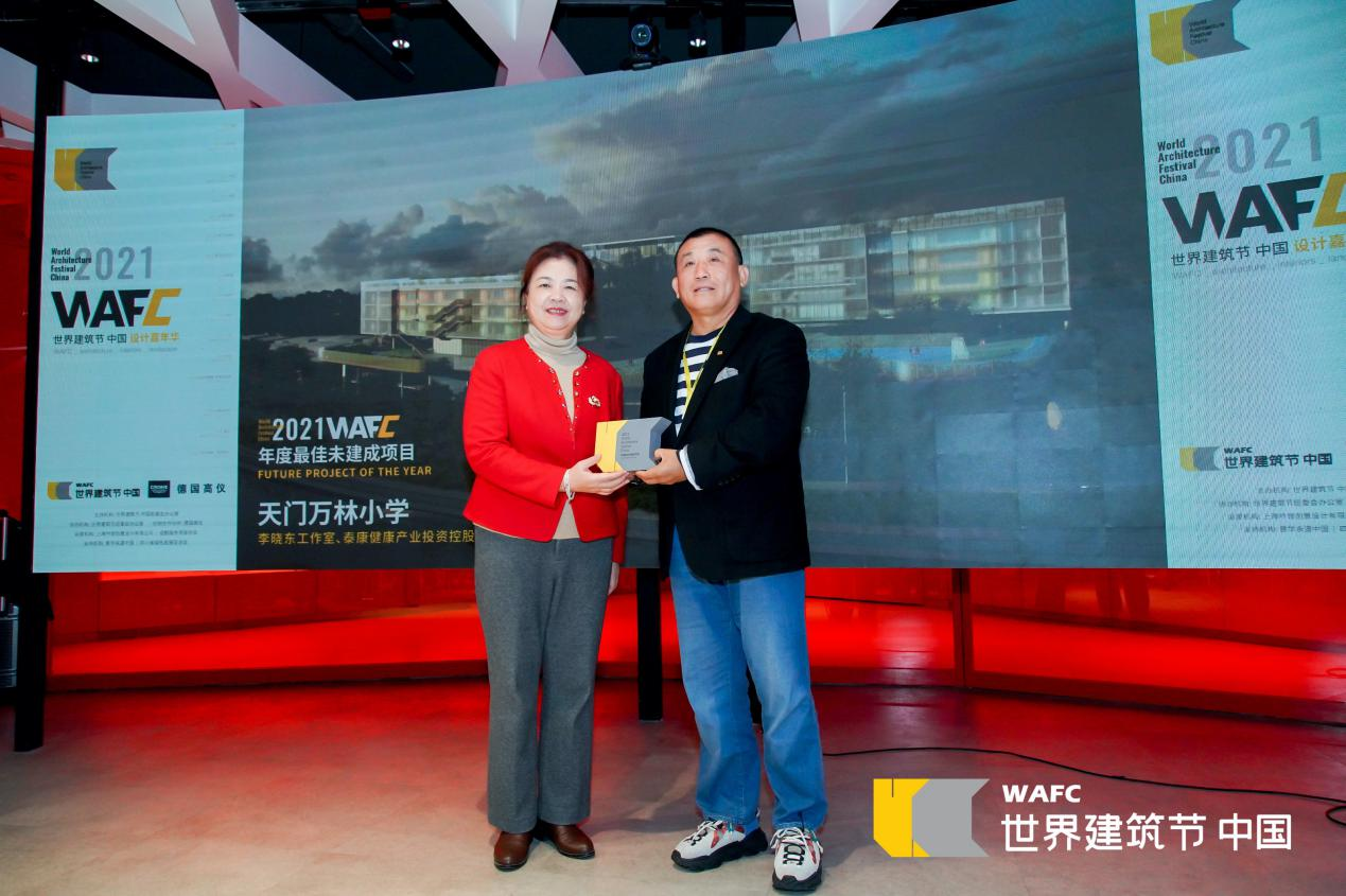 2021年11月4日, 2021WAFC世界建築節∙中國設計大獎賽頒獎典禮暨設計論壇在成都市高新區成都設計中心隆重召開。泰康健投高級副總裁兼首席終極關懷執行官陳平先生在領取WAFC年度設計大獎時發表感言:“湖北天門萬林小學是泰康保險集團董事長兼首席執行官陳東昇先生個人捐贈予家鄉母校的慈善公益項目,我們有責任一定要把它建設好!一個好的建築設計,要潛心挖掘建築的使用功能、社會價值和人文理念。泰康建築五年前就開始衝刺世界建築節大獎,曾遠赴歐洲衝擊獎項,但是分別在柏林和阿姆斯特丹都鎩羽而歸,這次非常有幸能在我們自己的國土上獲得世界建築節2021年度中國區未建成項目大獎。這個獎項不僅僅是頒給泰康健投和李曉東工作室,更是頒給所有熱愛建築設計,並用設計美化城市、詮釋人文精神的愛好者和追夢人!”