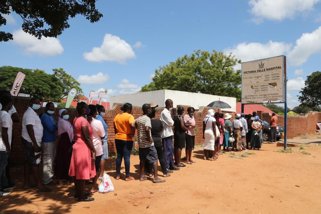 2021年3月24日,民眾在津巴布韋維多利亞瀑布城一家醫院門口排隊等待接種中國國藥集團新冠疫苗。新華社發(陳雅琴 攝)