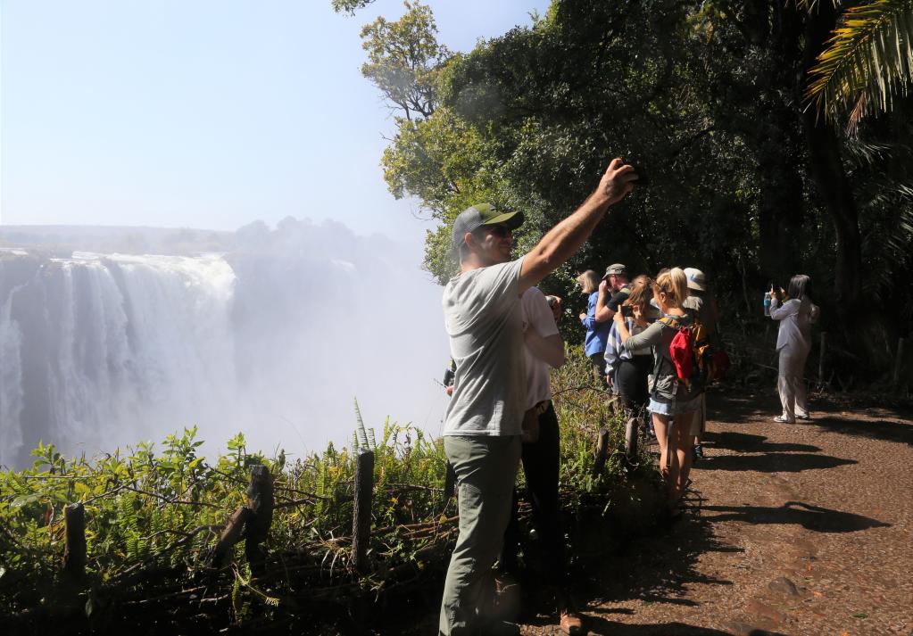 2019年7月18日,遊客在津巴布韋一側遊覽維多利亞瀑布。新華社發(陳雅琴 攝)