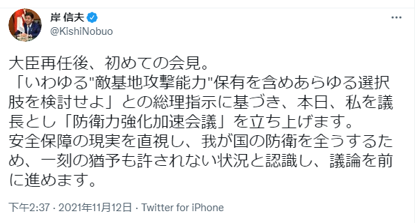 日本防衞大臣岸信夫12日在推特上稱,第2次岸田內閣成立後,自己首次召開記者會。他聲稱遵循首相岸田文雄“考慮包括獲得所謂‘對敵基地攻擊能力’等任何手段”(實現軍擴)的指示,即日設立所謂“防衞力強化加速會議”,並由自己擔任負責人。岸信夫還聲稱,“當前日本安全保障形勢“刻不容緩”,將推進(在增加防衞預算方面上的)議程進展”。