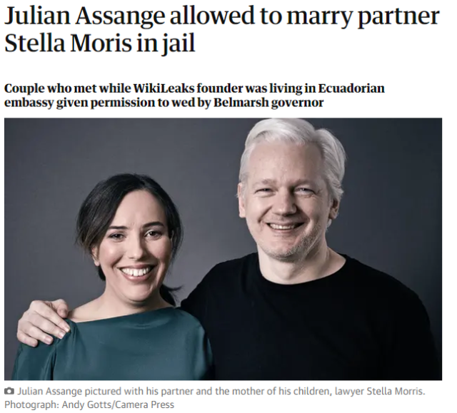 在向監獄長提出申請後,阿桑奇獲准與未婚妻斯特拉·莫里斯(Stella Moris)結婚。在阿桑奇在厄瓜多爾駐倫敦大使館尋求庇護期間,這對情侶結識並育有兩個孩子。