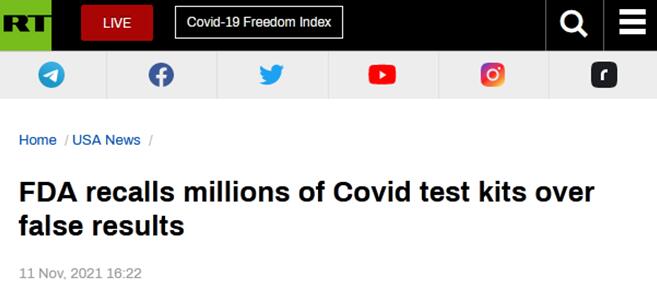 【環球網報道 實習記者 王藝璇】據“今日俄羅斯”(RT)11日報道,美國食品和藥物管理局(FDA)對於被用於檢測是否感染新冠病毒的家用試劑盒發佈了“最嚴重類型召回”聲明,至少有220萬個產品可能出現“假陽性”。