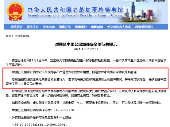 中國駐芝加哥總領館發表聲明稱,強烈譴責濫殺無辜的兇殘犯罪行為,要求美有關方面儘快查清和公佈案件情況,並採取切實措施,保護包括中國留學生在內中國公民的安全。