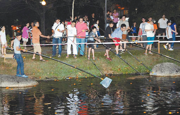 這項活動就是元宵節的“拋柑接蕉”,其本質有點像交友的漂流瓶,即在正月十五這天晚上青年男女將自己的聯繫方式寫在柑橘、香蕉等水果上,拋到湖泊或池塘中,待有緣人撈起後就會聯繫對方開始交往。這項活動實際上源自中國,古時候中國未婚少女平時往往足不出户,只有到了元宵節才被允許出門賞燈,這也成了不少青年男女物色心上人的好時機,因此元宵節素有“中國情人節”之稱。馬來西亞的“拋柑接蕉”起初是華裔未婚女子的一種祈願活動,在元宵節時向水中拋柑橘,祈求嫁個好丈夫。後來逐漸演變成了如今這種女子拋柑橘、男子拋香蕉尋覓良緣的大型羣眾“體育娛樂活動”。在一些熱鬧的公園,由於參加活動的人太多,擠不到水邊的年輕人只得像扔手榴彈一樣把水果投擲到水中,然後再舉着帶網子的竹竿衝到水邊去撈異性拋的水果,有些比較急迫“脱單”的人還會多扔多撈,一晚上忙活下來體力消耗着實不小。