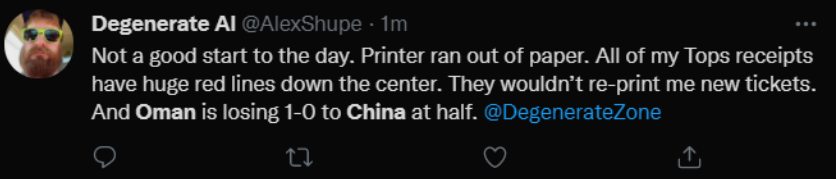 中場休息階段,有阿曼球迷略顯鬱悶:“這不是一天的好的開始。打印機沒紙了,我所有的上衣收據中間都有一條大紅線。他們不會給我重新印的。然後阿曼隊現在半場還輸着中國隊0:1。”↓