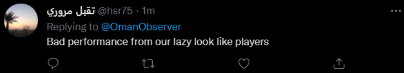 此時,被攻入一球的阿曼球迷顯然不滿意,有網友稱:“糟糕的表現,來自我們看起來懶散的球員。”↓