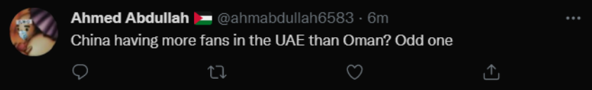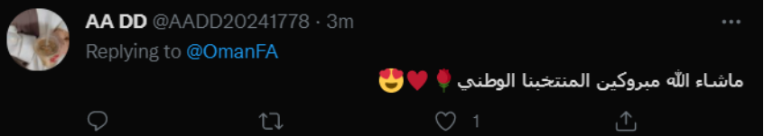 此後,1:1平局比分也保持至比賽結束。到手1分,仍保持積分榜上對中國隊的壓制,阿曼球迷似乎對結果比較滿意,有人發推:“恭喜我們的國家隊!”↓