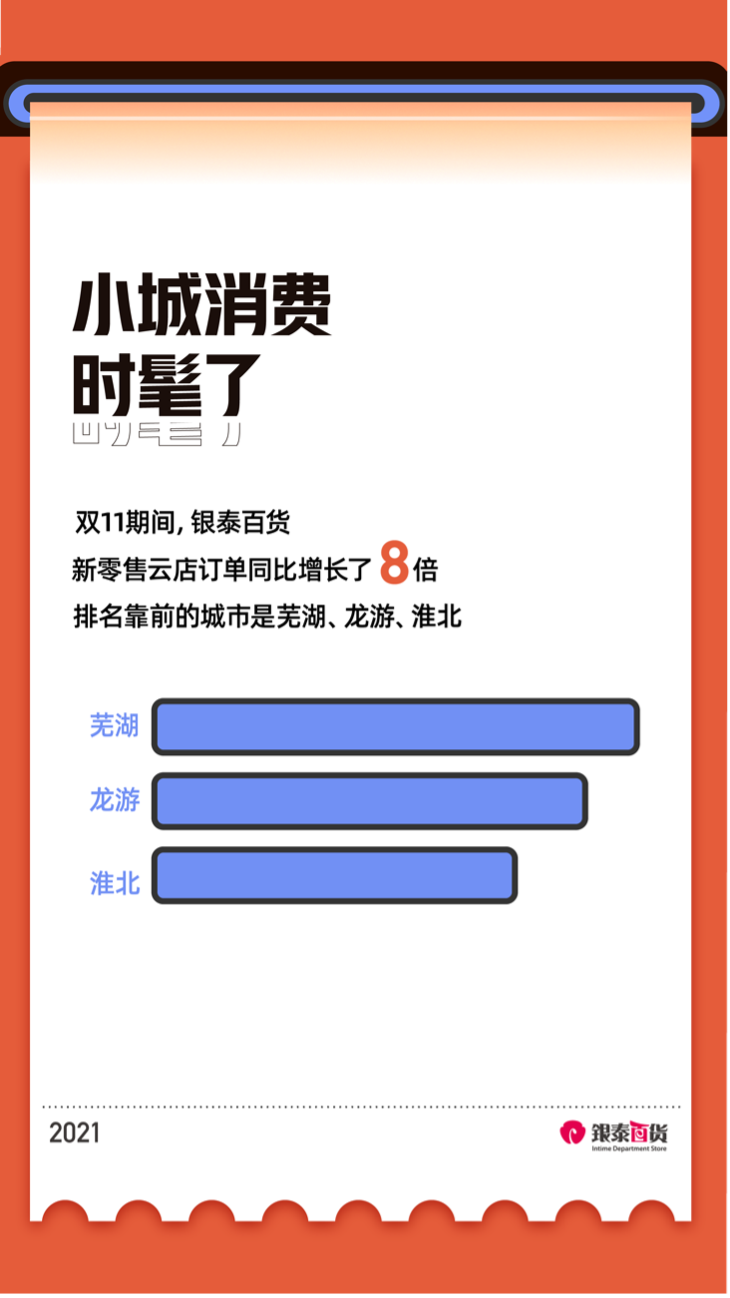 藉助新零售的能力,銀泰百貨也正在幫助更多品牌進入新興市場,讓小城青年也能獲得專櫃正品體驗。據統計,雙11期間,銀泰百貨新零售雲店訂單同比增長了8倍,銷售排名靠前的城市是像蕪湖、龍游、淮北這樣的小城,其中,面積僅21平的蕪湖雲店更是創下了單店銷售破千萬的好成績。