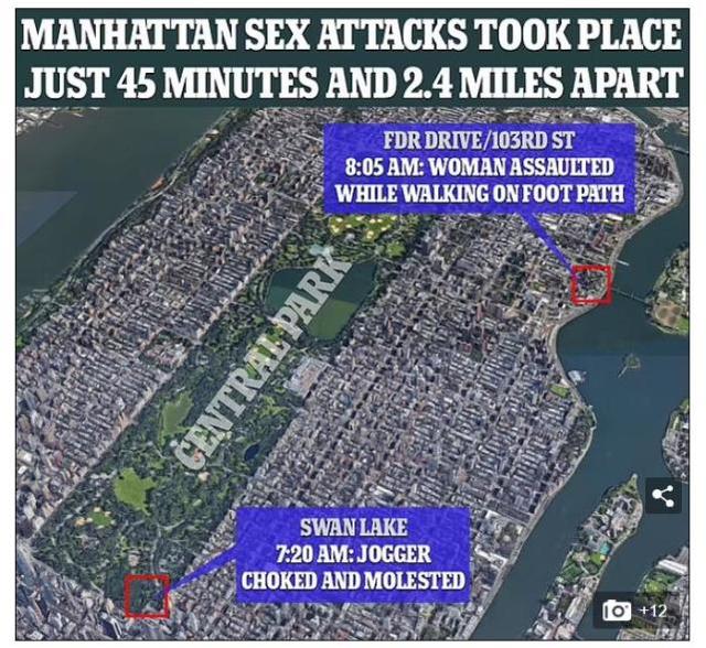 紐約警察局表示,當地時間11月11日早上7點20分,一名20多歲女性在慢跑穿過中央公園時被撞倒在地並遭性侵。她在襲擊中昏了過去,甦醒後向警方報案。大約45分鐘後,又一名女子在一條人行道上遭到侵犯。