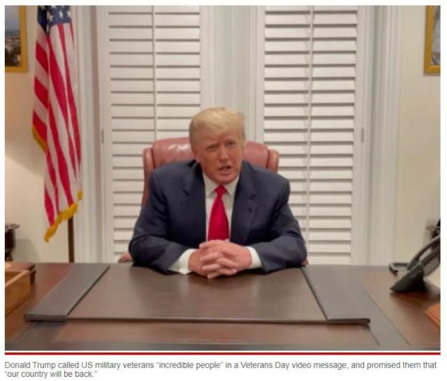 據《紐約郵報》11日報道,美國前總統特朗普發表視頻講話稱,美國退伍軍人是“了不起的人”,並向他們承諾“我們的國家會回來的”。