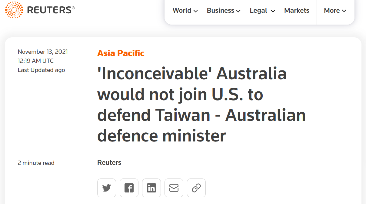 據路透社報道,達頓13日在接受採訪時宣稱,如果華盛頓採取行動“保衞台灣”,澳大利亞若不加入美國,是“難以想象的”。達頓稱,“也許在某些情況下我們不會採取這種選擇,但我無法想象那種情況發生”。而就在此前,美國國務卿布林肯聲稱,“如果中國大陸單方面使用武力破壞現狀,很多國家不會袖手旁觀……一旦發生這種事情,他們也會採取行動。”但布林肯並未説明他指的是什麼樣的行動。