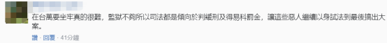 對此,有島內網友諷刺:在台灣要坐牢真的很難,監獄不夠所以司法都是傾向於判緩刑及得易科罰金,讓這些惡人繼續以身試法到最後搞出大案。↓