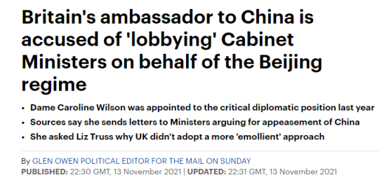 英國《每日郵報》當地時間13日發表題為“英國駐華大使被指代表北京政權‘遊説’英國內閣大臣”的文章,援引所謂消息人士的話説,吳若蘭曾致信出席英國國家安全委員會(NSC)內部會議的內閣成員,“有效地爭取對中國綏靖”。