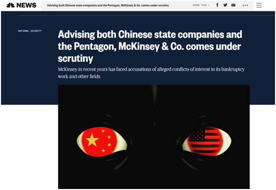 報道稱,麥肯錫與美國聯邦政府簽訂的諮詢合同,使得這家公司對美國的軍事規劃、情報和高科技武器計劃有着“內部人士”的瞭解。NBC的調查聲稱,該公司還為中國國有企業提供諮詢服務,這些企業支持北京在太平洋地區的海軍建設,並在中國擴大全球影響力的努力中發揮了關鍵作用。