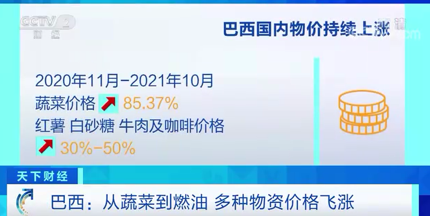巴西國家地理統計局公佈的數據顯示,過去一年,巴西蔬菜價格漲幅超過85%,紅薯、白砂糖、牛肉和咖啡的價格漲幅在30%至50%不等。 過去的一個多月,燃油價格上調了三次。